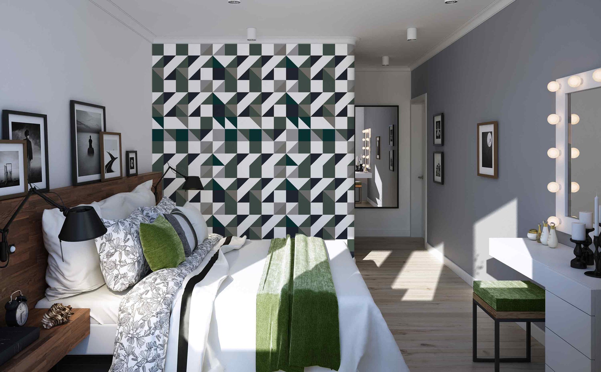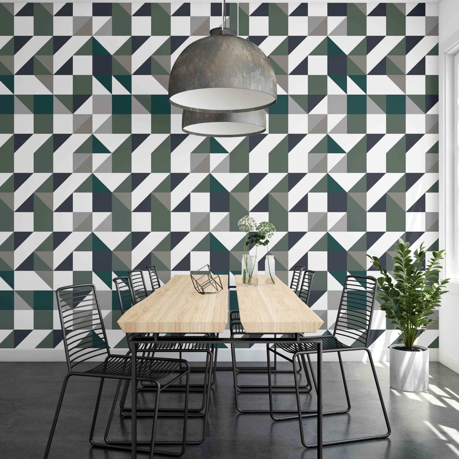 Líneas y formas geométricas se entrelazan en un patrón cautivador, creando una sensación de dinamismo y equilibrio. Los tonos verdes evocan una conexión con la naturaleza, transmitiendo frescura y armonía. Este mural añade un toque moderno y vibrante a cualquier espacio, invitando a la contemplación y apreciación de la belleza geométrica.