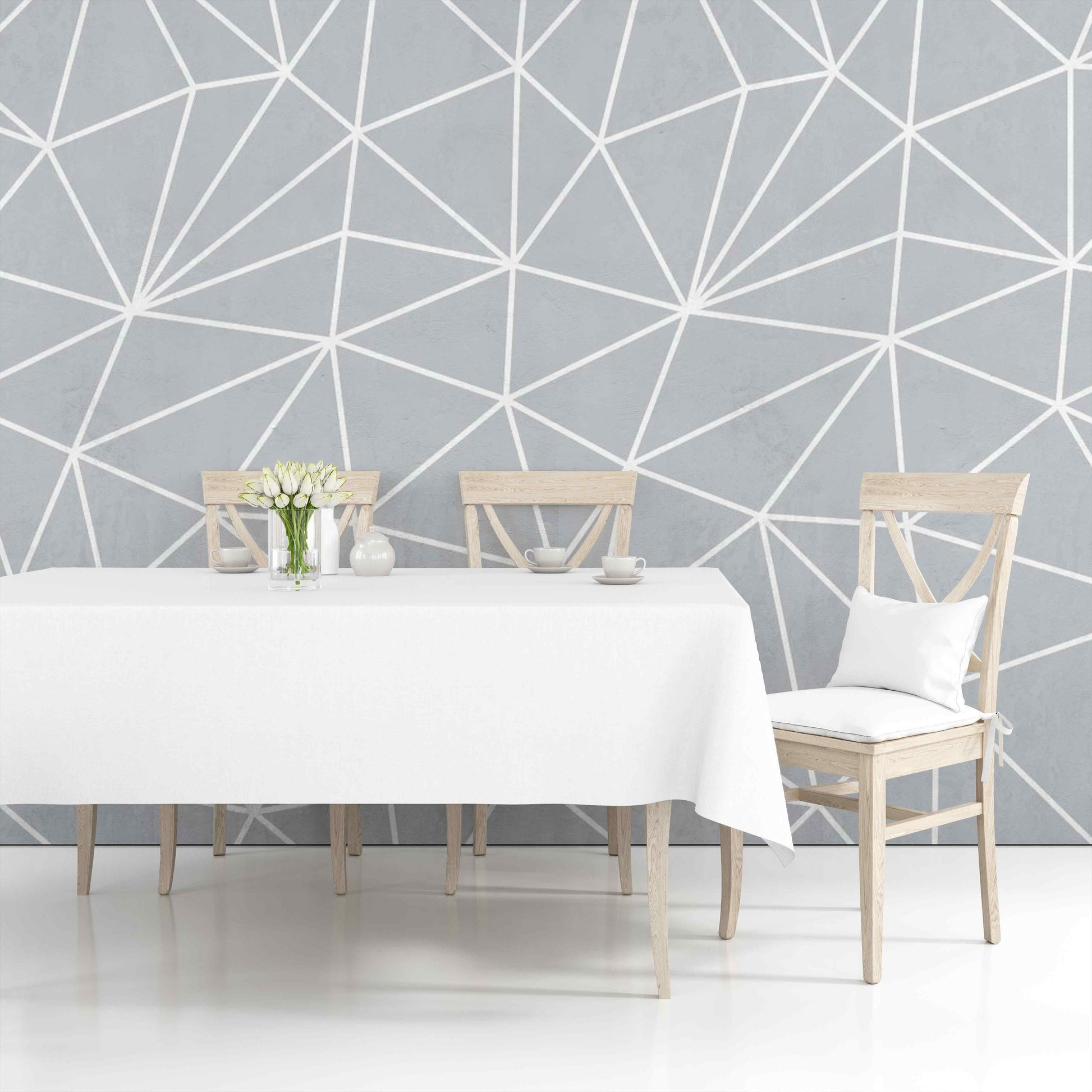 El mural de triángulos grises con líneas blancas es una obra de arte intrigante y dinámica. Los triángulos grises se entrelazan en una composición geométrica, creando una sensación de movimiento y equilibrio. Las líneas blancas añaden un contraste nítido, realzando la estructura y la profundidad del mural. Este diseño geométrico aporta una estética moderna y contemporánea, agregando un toque de estilo distintivo a cualquier espacio.
